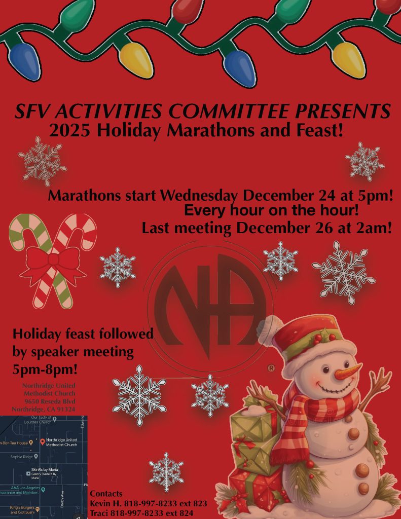 - HOLIDAY MARATHON MEETINGS & FEAST – 12/24 5:00pm to 12/26 2:00am – Northridge (Reseda Blvd. & Superior St.)